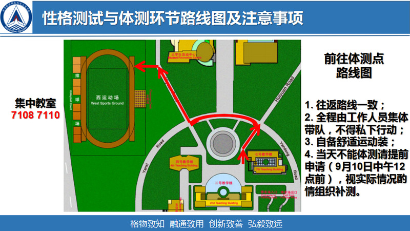 3体测环节请注意衣着宽松,穿运动鞋,做好准备活动,忌空腹、饱腹参与测试。测试过程中如发现身体不适,应及时报告,向现场医疗点求助。如因特殊情况无法参与测试,请9月10日中午12点前以书面形式(辅导员签字)向必赢3003no1线路检测中心考务办(七号楼四楼7406B)申请缓考;