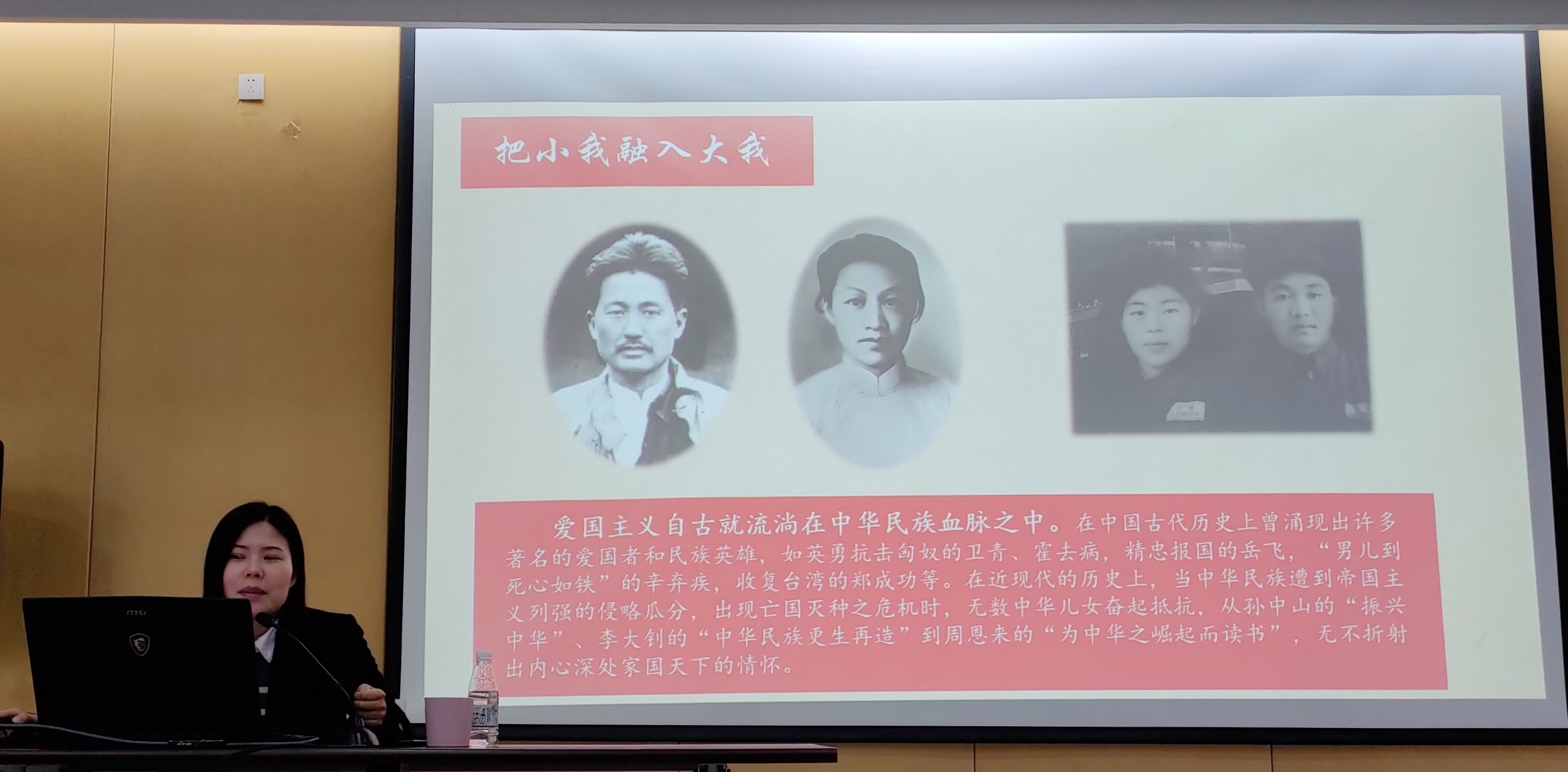 何畏通过分享影片《何以为家》, 介绍汉字中“家”与“国”的演变过程及展示南京老城照片,向学生阐释国与家的关系。同时,何畏围绕习近平总书记在纪念五四运动100周年大会上的讲话中 “个人的命运与国家的命运相连,小我融入大我”的内容指出,人民群众是历史的推动者,中国发展到今天,不仅在于那些有名有姓的英雄,还在于整个民族涌现出了无数的无名英雄为之奉献和奋斗。也正是无数的无名英雄铸就了如今的中华民族,如今强盛的中国,这就是小我融入大我的最好阐释。