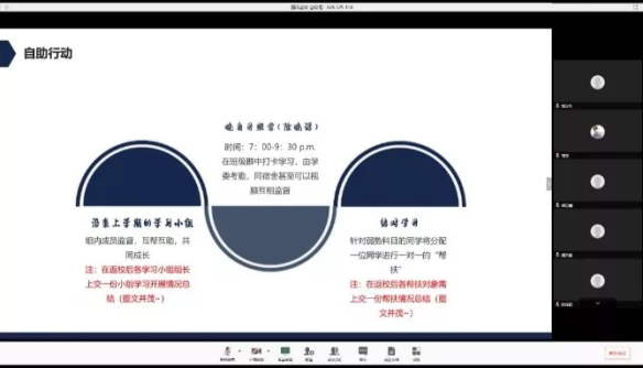 针对 “自助”行动,班会建立了线上学习小组和“一对一,多对一”帮扶小组,并详细讲解了小组的实施办法,提出认真落实的要求。部分班级总结了线上学习小组开展一周的情况,对学生学习投入度有明显改善。