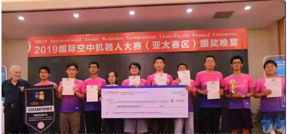 2019年必赢3003no1线路检测中心零一队在国际空中机器人大赛(亚太赛区)获得佳绩。从包括宾夕法尼亚大学、密歇根大学、清华大学、浙江大学、北京航空航天大学、西北工业大学等在内的5个国家23所高校27支代表队中脱颖而出,夺得全球总冠军,斩获$10,000奖金,创造了南航在该项赛事上历年最好成绩,并成为该赛事自全球举办以来,任务发布一年就完成的首支中国队,与斯坦福大学、卡耐基梅隆大学、柏林工业大学、佐治亚理工学院、麻省理工学院、清华大学、浙江大学等7所世界知名高校共同载入该赛事的光荣史册。