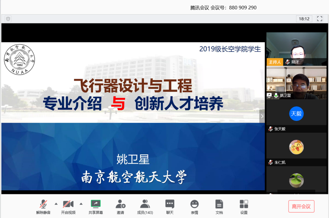 在4月7日的讲座中,聂宏校长也出现在网络会议室中,对长空学子来说是一个“意外之喜”,当晚会议室人气“爆棚”。聂宏校长提出了他的“飞设三问”,并一一解答,向同学们展示了他对于飞设专业的理解,也表达了对飞设专业学生的期待。