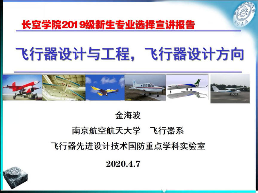 夏品奇老师对于直升机专业的介绍后,4月7日,航空学院飞行器系金海波老师就飞机设计这一专业方向为同学们进行了系统介绍。金老师从专业依托学科和航空学院院系设置讲起,谈到专业人才培养目标:未来飞行器设计的总设计师、未来航空航天科技开发的总工程师、未来航空航天事业的开拓者和领导者。金老师讲解了飞机设计的含义,指出飞机设计的过程充分体现了科学性和创造性,相比工业设计和建筑设计依托感性与艺术,飞机设计更多依赖严密的分析推理和严谨的理论逻辑,在工具的支持下,发挥人的主观能动性,用联想化无为有,在逐步细化的工程中发现矛盾,在解决问题的过程中反复迭代、多轮逼近。金老师在谈及创造思维时特别强调:飞设注重创造性与直觉思维,在构思过程中不需要特别严谨,设计是逐步演进的过程,在经过充分的论证后,符合时代发展要求的方案将被选中,其余则被淘汰,联合左右脑创造思维的天马行空下涌现更多方案选择,出现更多划时代的创新产品,如此才能极大地推动社会发展。讲座第二部分,金老师从飞机设计的研究方向入手,分为总体、结构、系统三大模块,具体阐述了各个模块包含的理论技术。第三部分,金老师从飞设系人才培养条件、实验室与创新基地、历史上的重大成就、杰出学生代表四方面着重介绍了系所使命。