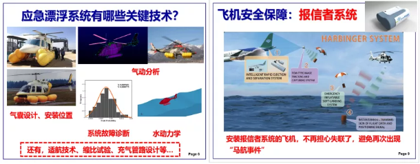 孙老师说:对飞机或者飞行器来说,不同的历史时期,它所面临的要求是不一样的。初期,比如说一战、二战时,航空以效能为首位;技术发展到今天,可以看到,飞行器特别是民航方面,安全、效能、舒适性和经济性在作为航空技术发展的一条主线。“安全”一定是我们在整个航空领域里面是摆在首位的。飞行器的安全救生方向其实涉及的面很宽。现在,随着海洋权益与海上直升机使用越来越多,直升机的安全救生技术需求日益旺盛,我们课题组花了大概十年时间,一直从事直升机海上应急救生技术研究,以及对民机越洋飞行救生技术的进行了系统研究: