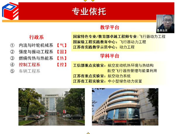 对于第二个问题,黄老师首先从专业依托的角度介绍了飞动专业的行政系、教学平台和学科平台,飞动专业有内流与叶轮机械系、强度与振动工程系、燃烧传热与热能系、控制工程系分别对应“气”、“固”、“热”、“控”四个研究方向,另有车辆工程系。其中控制工程系是飞动专业强有力的支撑,相应的教学平台与学科平台十分优越。黄老师指出控制工程系的方向特色是飞/推综合控制理论与方法和航空发动机建模、仿真与故障诊断,并具体介绍了多种成果应用,包括多种部件级实时模型应用于国内发动机研制以及各类省部级、国家级奖项。谈到教学科研团队时,黄老师通过介绍控制工程系涌现出的国内著名控制、测试专家和现有教师、硕博研究生,指出我校从事航空发动机控制方向研究的人员数量和科研方向覆盖面都非常强。黄老师还详细介绍了培养体系,他表示飞动专业的教育理念可以概括为“大工程观”,注重培养学生多学科知识体系、创新意识和工程实践能力。黄老师也顺势明确了专业的学分要求,并就专业必修课、通用专业选修课、专业方向选修课三类课程具体介绍了控制方向有关的课程。黄老师还特别强调了专业分流后的学习不分具体方向,有分方向的选修课程,所有的课程都是为了支持飞动专业的学习,只有到了研究生阶段才会细分研究方向。黄老师表示每年控制工程系会组织很多科创活动来促进学生的实践能力培养,并以2019年南航“零一队”在国际空中机器人大赛夺得全球总冠军为例,再次强调了创新意识培养的重要性。最后,黄老师介绍了控制工程系中依据航空发动机控制系统开发流程建设的主要教学科研设施,并展开了对“全数字仿真——HIL仿真平台——半物理仿真——台架试车”这一开发流程的详细讲解。