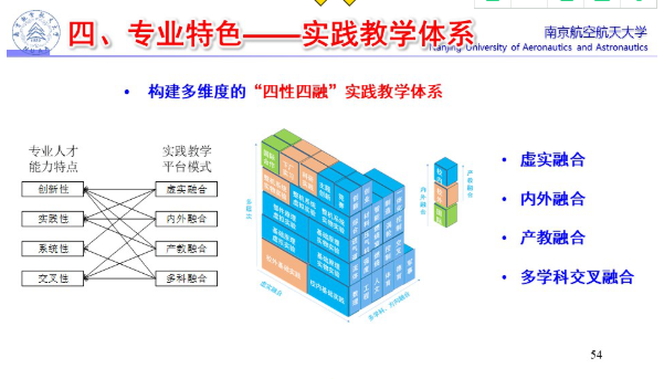 张老师又进一步介绍了飞动专业“四性四融”实践教学体系。针对“创新性、实践性、系统性、交叉性”四个飞动专业人才能力特点,提出了“虚实融合、内外融合、产教融合、多学科交叉融合”的实践教学平台模式。张老师详细介绍了四种实践教学平台,虚实融合的发动机实践教育平台就是利用虚拟仿真技术来解决不容易感知、体会的发动机内部的物理现象。张老师分别展示了实物实验平台和虚拟实验平台的代表,解释了内外融合就是利用校内、校外、国外的教学资源建立实践教育中心和协同育人平台,产教融合就是校、厂、所共建实践平台,师生密切参与企业的科研攻关,把科研生产与人才培养紧密结合,多学科融合就是借助校内资源,构建涵盖”气”、“固”、“热”、“控”、电气、信息、材料等领域各类主题创新区。张老师还通过展示学生在各类科创大赛中取得的优异的成绩介绍了飞动专业针对创新创业训练建立了“贯穿培养全过程”的过程指导与考核体系。