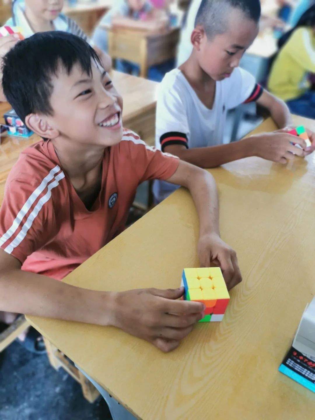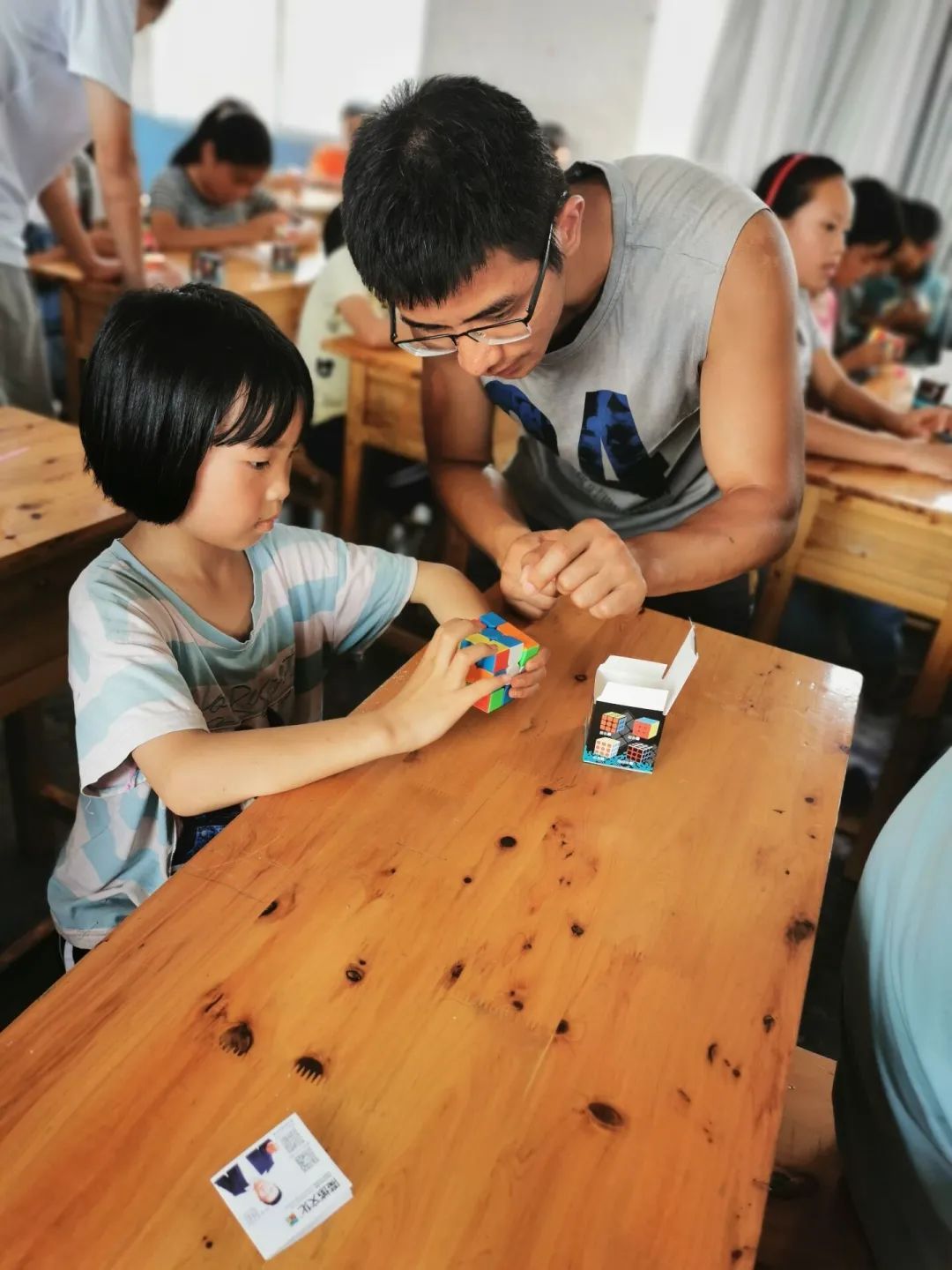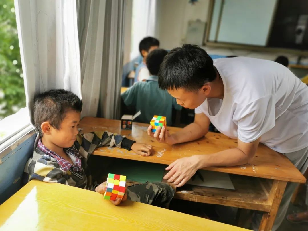图为7月24日老师教大家三阶魔方。学习魔方,不仅是为了缓解大家学习的疲劳,更是锻炼大家的思维能力、空间想象能力以及动手能力。小朋友们在还原魔方时,脸上都露出了认真的神情。当大家亲手将魔方还原成原来的模样时心中充满了成就感,即使只还原出了一个面也露出了骄傲的笑容。