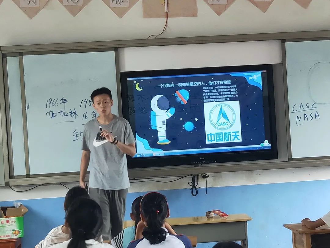 作为南航学子和航空航天类专业的学生,支教团成员带着他们对航空航天事业的热爱而去,用热情点燃小朋友们的航空航天梦。课程设置上必不可少的就是趣味航空航天知识,由老师介绍航空和航天的区别,飞机和火箭的区别以及各种各样的飞机,还展示了国产大飞机C919、水中鲲龙AG600、 我国自行研制的全球卫星导航系统“北斗”和实现月球背面软着陆的月球探测器“嫦娥四号”等。