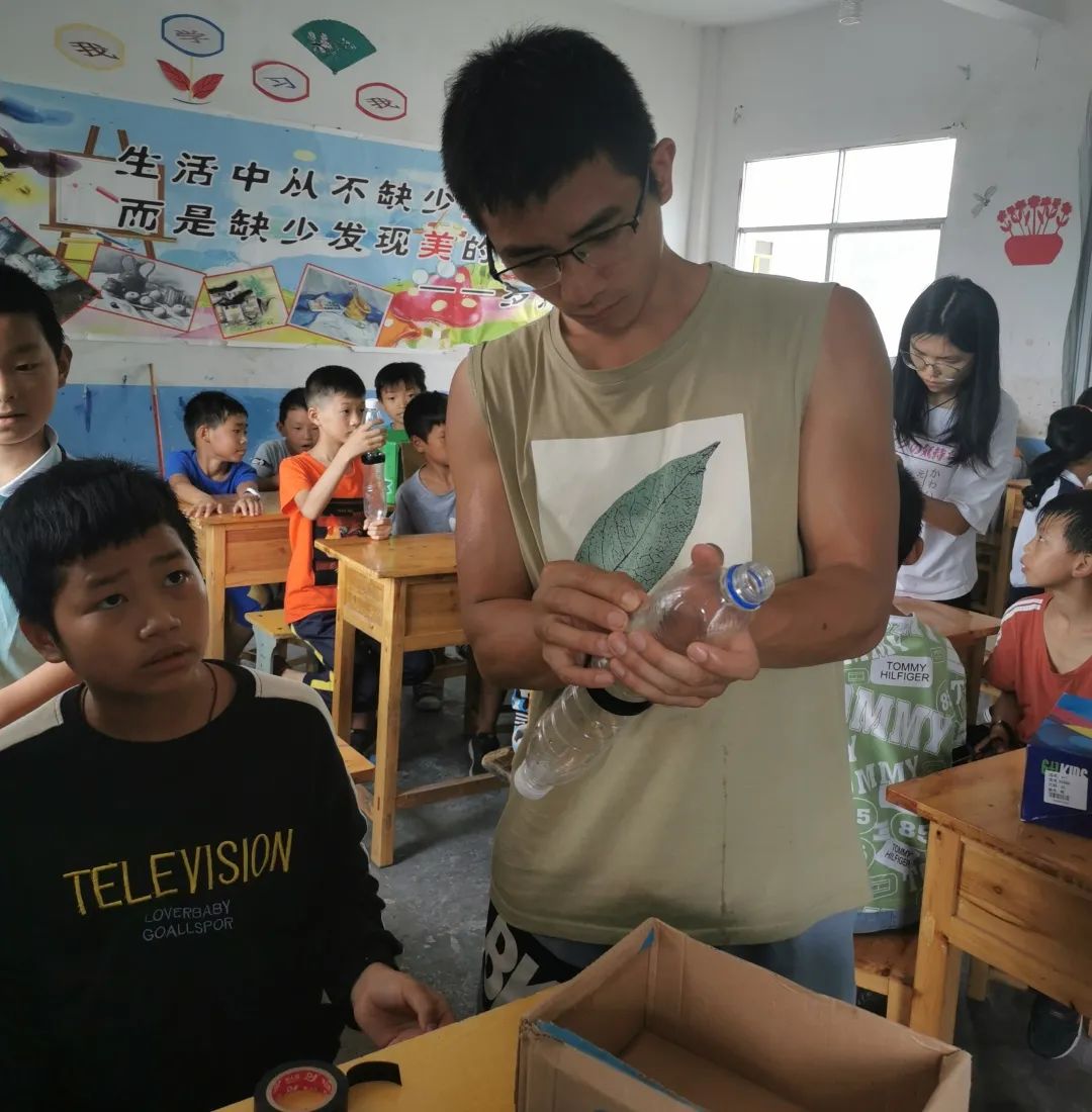 图为7月20日老师带领大家一起制作水火箭。水火箭依靠质量比和气压一飞冲天,能够充分引起大家对于物理学的兴趣。同时制作水火箭要求大家团队合作一致,齐心协力的同时又要分工合作,充分锻炼了大家的团队协作能力。大家都期待自己小组制作的水火箭能够飞的最高最远!