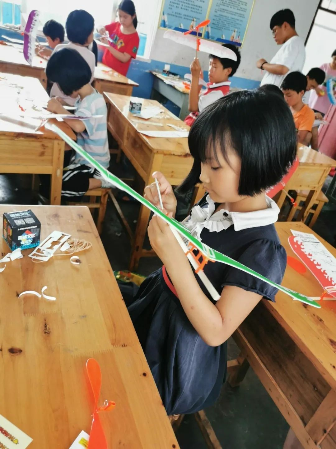 图为7月26日老师教大家制作模型飞机。小朋友们认真的模样让人感动。常说祖国的未来在于青年人,当这群孩子们有了理想,将飞天的梦想注入手中的模型飞机,中国腾飞于世界便也充满了希望!