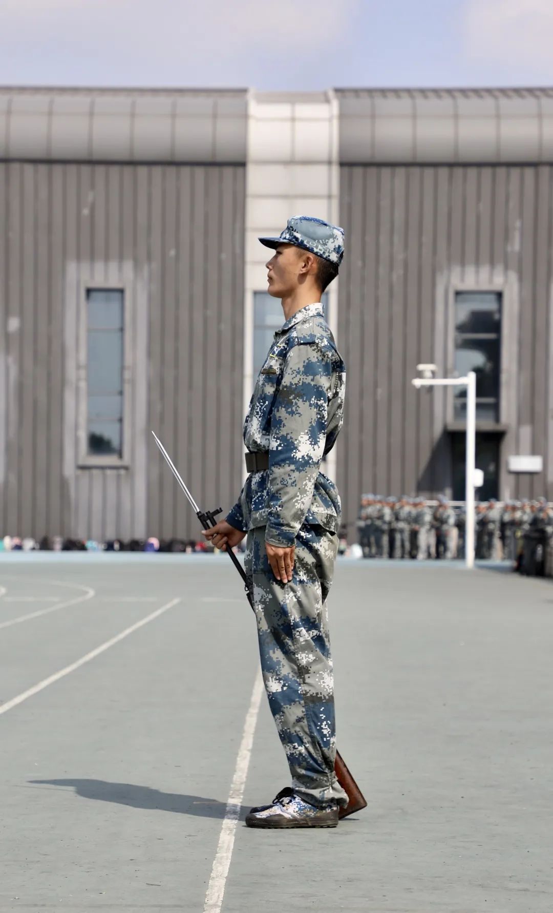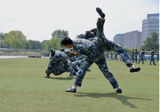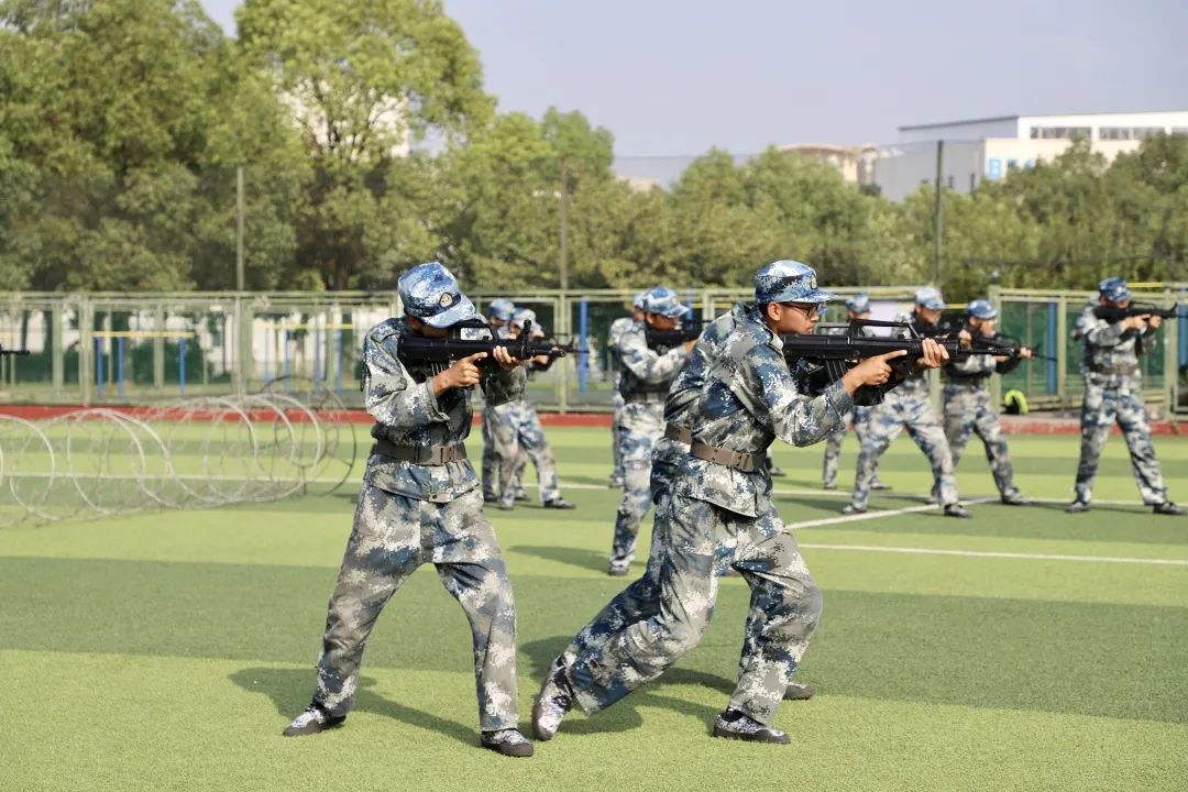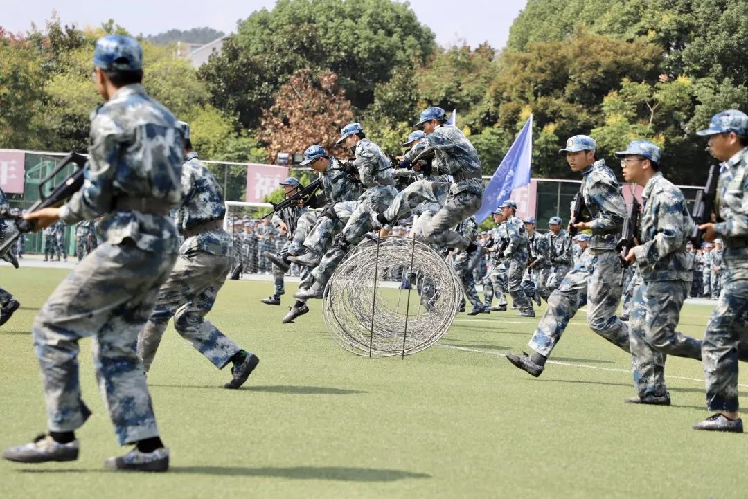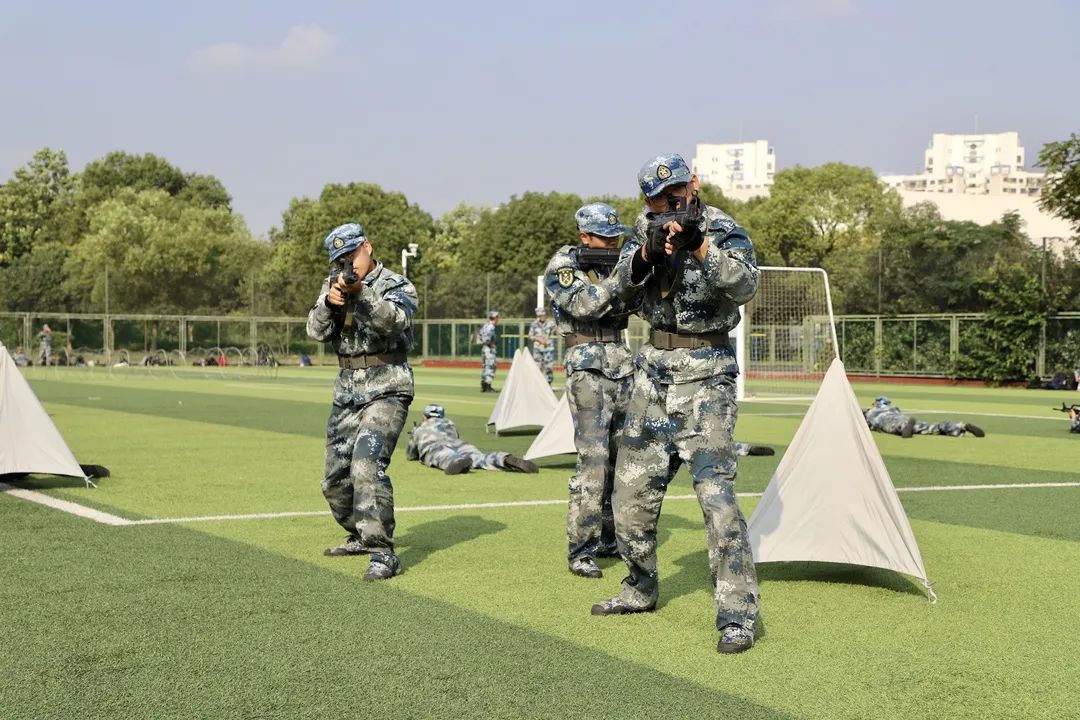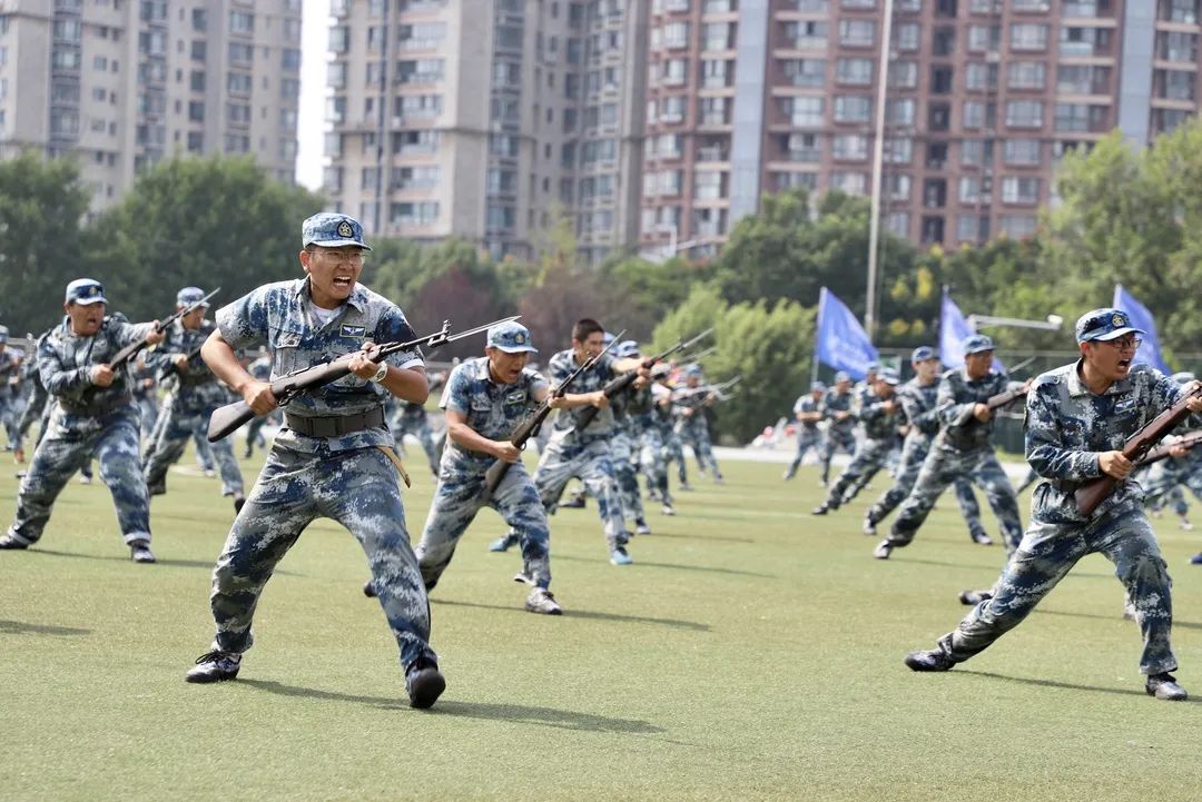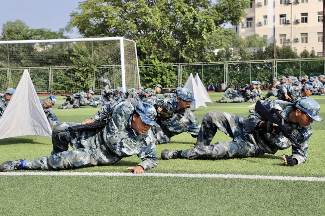 旭日初升,万里无云,新的一天开始,同学们早已跃跃欲试,在各自的方阵等候教官下达指令。随着教官的一声令下,他们目光坚定,直视前方;他们踢腿生风,健步如飞;他们雄姿勃发,气贯长虹;他们钢枪紧握,势不可挡。侧倒、后倒、搏击,格斗方阵在绿色与绿色碰撞声中展现长空人的刚毅;卧倒、越进、匍匐,战术方阵带着满身的淤青和伤痕却依旧眼神雪亮,坚定目视前方。