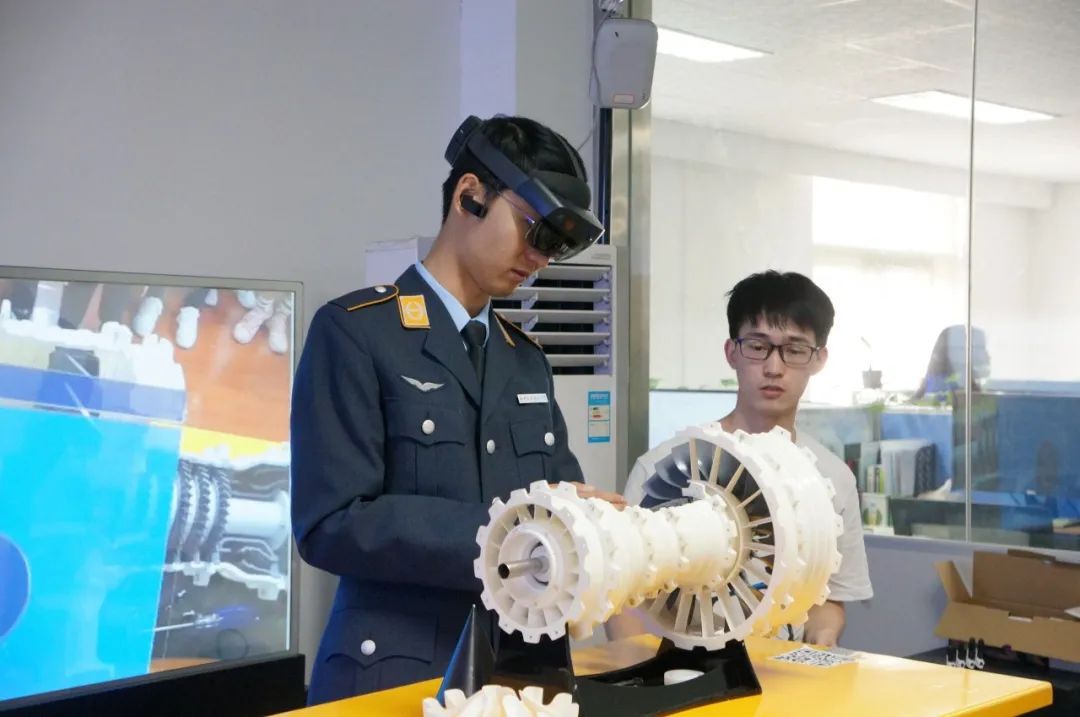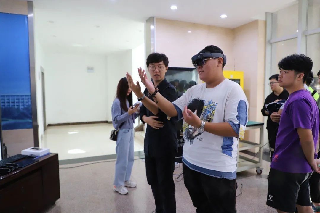 讲解员首先介绍了机器人智能装配,随后针对工业机器人加工颤振结构、机器人刚度强化技术、机器人精度补偿技术三个方向具体介绍了这一技术的发展并带领同学们参观了实验设备。智能装配实验室另一个研究方向是数字孪生与虚拟仿真技术,讲解员以C919为例向同学们讲解了大型飞机结构的智能化检测,同时展示了通过视觉技术、轨道计划和误差分析进行的大型结构装配过程,借助实验室开发的项目,许多同学体验了飞机装配模拟以及增强现实技术。
