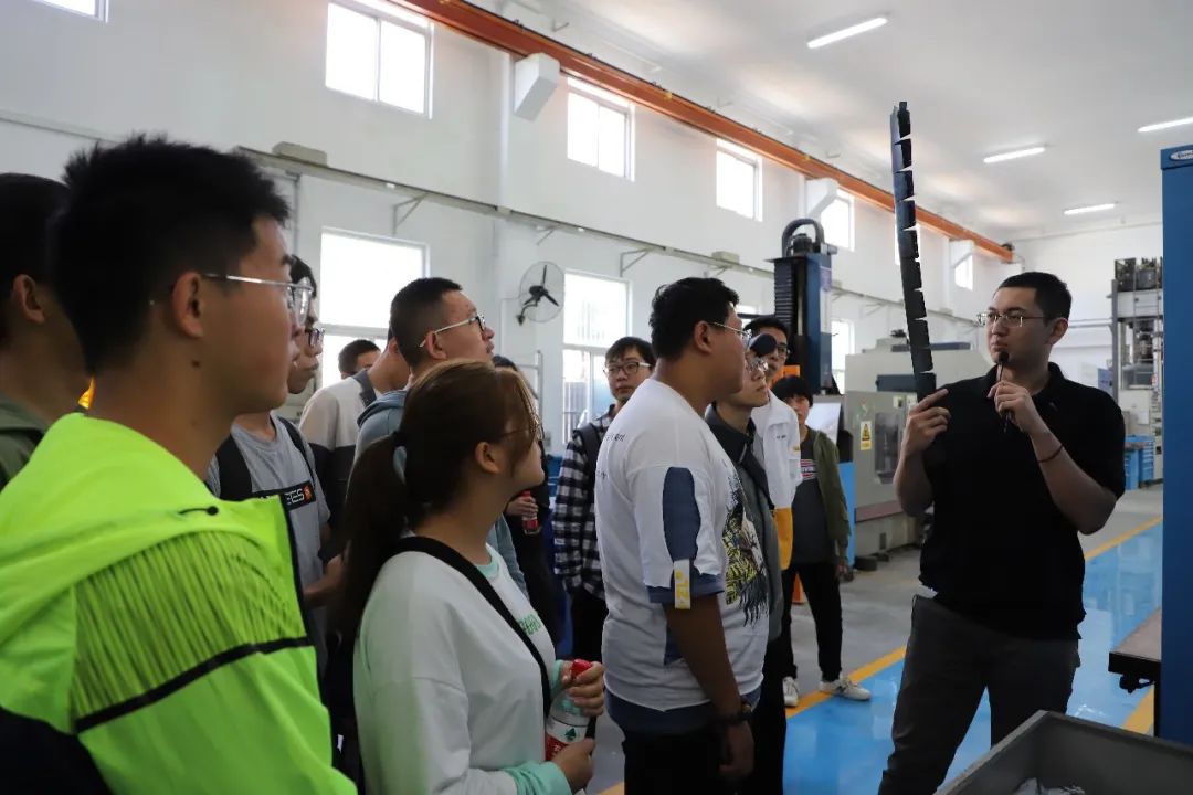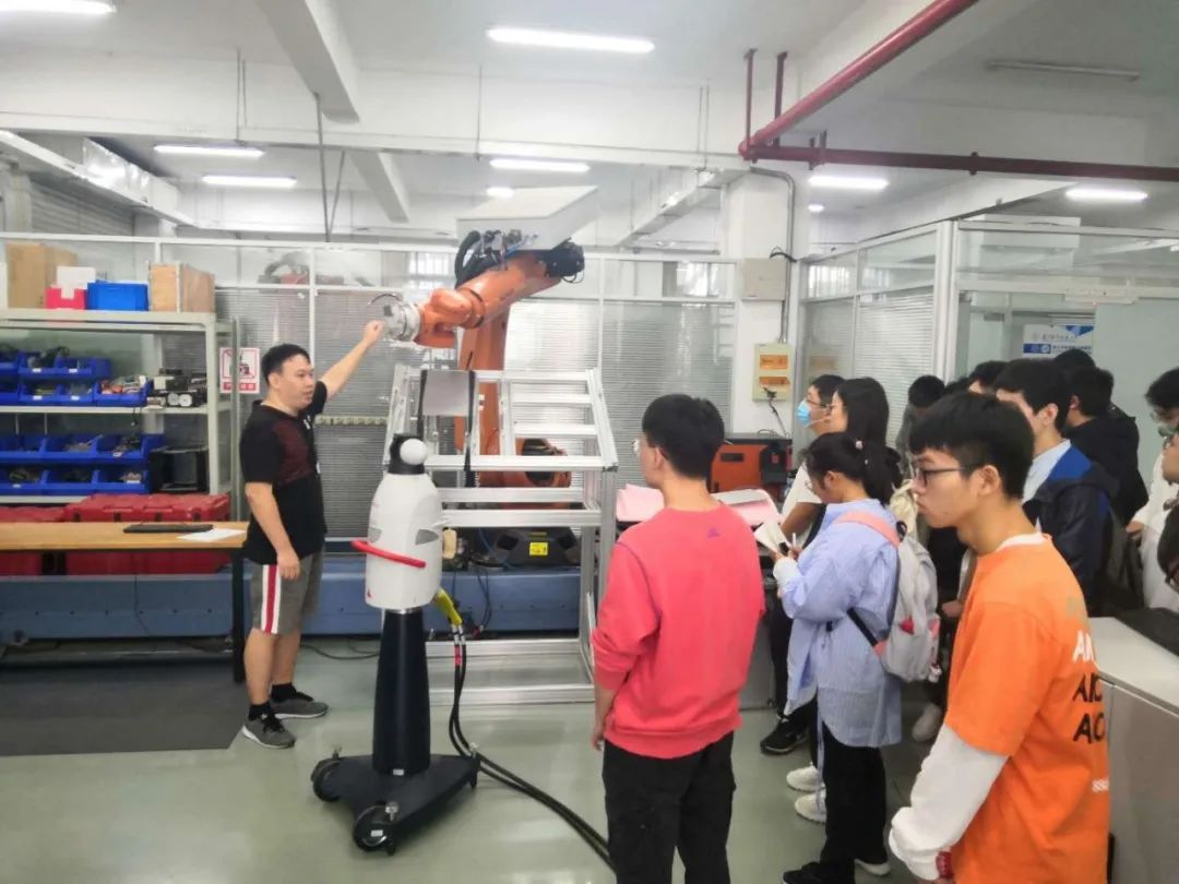 讲解员首先向同学们介绍了实验室的主要研究方向为飞机装配与数字化测量,通过展示一架机器人自动化测量装置为同学们讲解数字化测量的原理,随后讲解员又分别向同学们展示针对大型飞机、小型结构件、大型重结构件的装配与测量设备,同时详细讲述了飞机翼身对接工装的过程。最后讲解员为大家演示了数字化装配与测量中经常使用的智能牵引小车,阐述其运动原理。