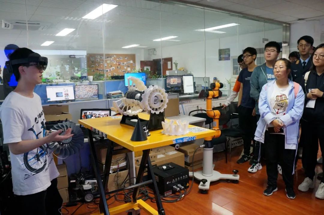 讲解员首先从正在承担的项目研究、课题组研究方向、实验室杰出人员三方面为同学们简要介绍了智能制造实验室,随后详细介绍了数字孪生、大数据、物联网、增强现实四个研究方向。讲解员表示,通过一系列的技术,实验室研究成果可以提高制造车间的运行效率,减少人力的浪费,讲解员还为大家展示了AI增强现实眼镜的使用并邀请同学们参与体验。