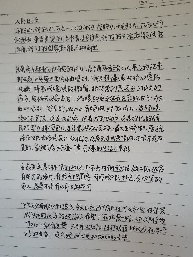 作为一名团支书,我在入学后就养成了阅读人民日报的习惯。从人民论坛到人民时评,从“深夜聊一会儿”到“评论员观察”,每个模块的阅读都让我受益匪浅。在阅读的同时,我习惯阅读一些经典片段,并做好笔记。即便现在已经开始网课学习,我也会在忙碌的学习之余每天坚持用半小时到一个小时来阅读。