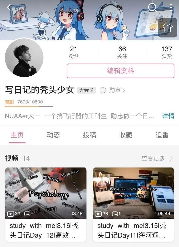 刚开始线上学习的时候,我的自觉性很差。后来无意在b站看到一些延时摄影的视频,突然想到,其实自己也可以做一个学习博主,一方面监督自己的学习,另一方面也可以记录生活。于是,为了提升视频质量,我开始收拾、精心布置我的书桌,学习剪辑,找不同的音乐去搭配不同类型、不同节奏的视频。刚开始,很少有人去关注我的视频。慢慢的,身边的一些朋友告诉我,我每一期的视频他们都会看,以此来督促自己的学习,甚至有越来越多的朋友开始跟我一起做学习博主。现在,做一名学习up主,不仅可以督促学习、记录生活,更是我学习之余一种最好的调剂。
