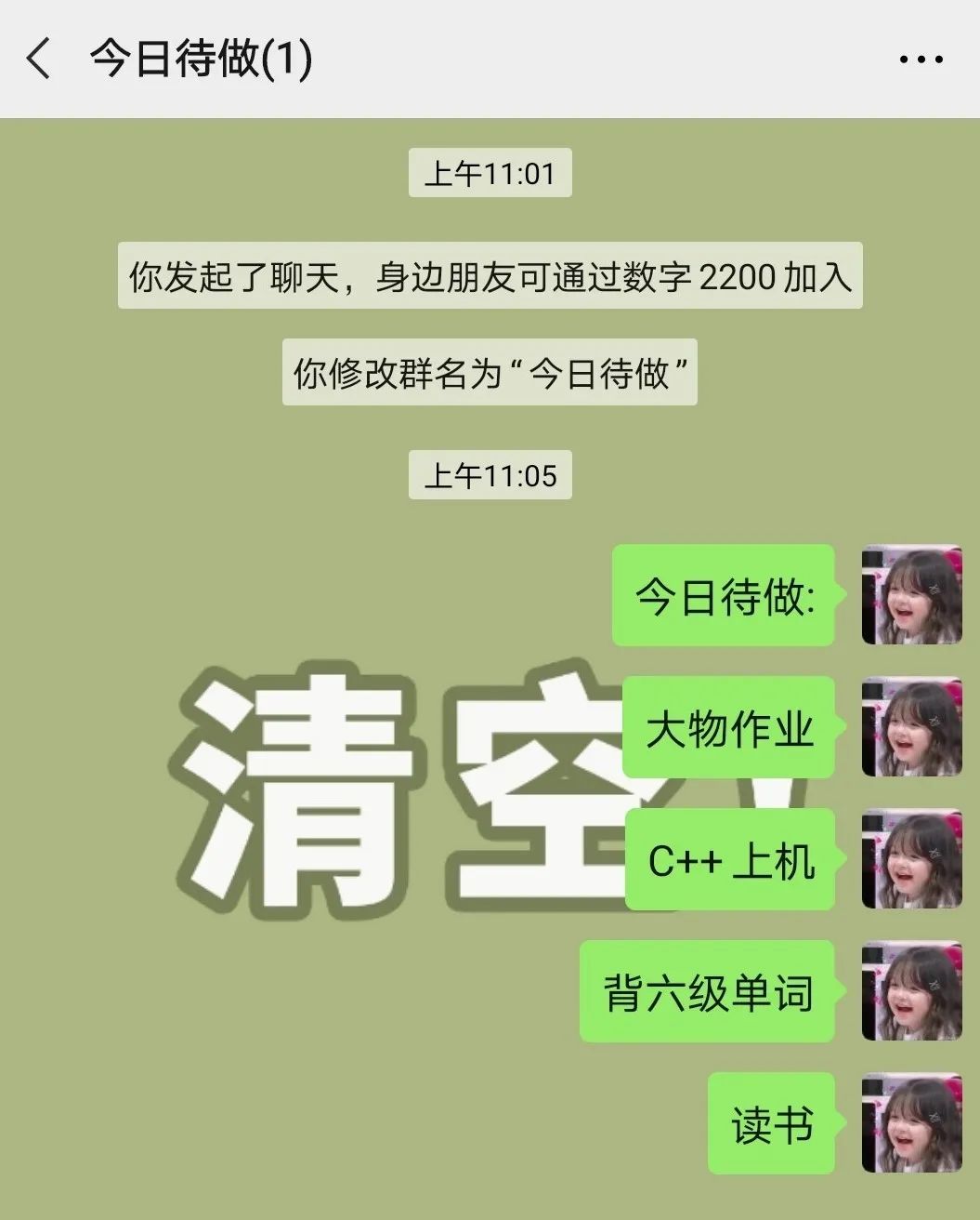 利用微信制作待办清单:在微信选择面对面建群,建一个只有自己的群,输入自己每天要做的事情,并置顶,完成一项删除一项,当一天过去清空了所有待办事项,你将收获满满的成就感。