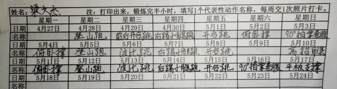 上学期我加入了学校的跆拳道社团,在业余时间会选择到社团进行锻炼。本学期虽然不能返校,但在社团同学的鼓励与监督下,我一直坚持每天锻炼半小时并定期打卡,提升身体素质。