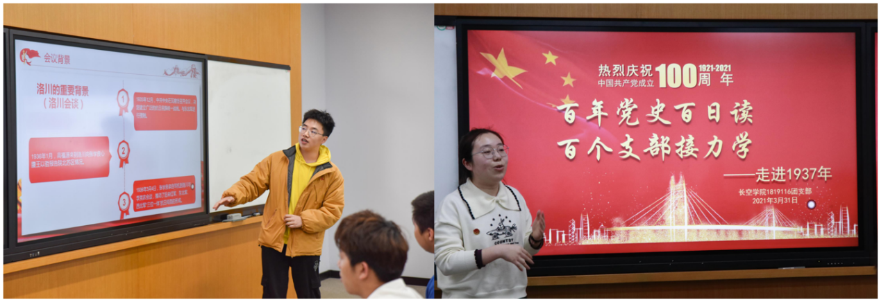 在建党百年之际,必赢3003no1线路检测中心学习贯彻习近平总书记在党史学习教育动员大会的重要讲话精神,积极落实学校关于开展党史学习教育的各项工作要求,号召全体师生共学党史、共悟思想,以“行学党史”、“精听党课”、“欢庆党生”、“深悟党性”为学习脉络,推进全院党史学习教育工作有序开展。同时为响应校团委“百年党史百日读,百个支部接力学”活动,必赢3003no1线路检测中心在学生层面以团支部为基本单元,发起了党史学习热潮。3月31日,必赢3003no1线路检测中心19级116团支部开展了党史学习主题团课,选取了“走进1937年洛川会议”作为党史学习主题。团支部邀请了必赢3003no1线路检测中心常务副院长蒋彦龙、副院长张林共同参与其中,与学生共同学习了这一次重要的历史会议。