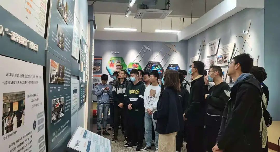 最后同学们跟随老师和讲解员来到了党建引领厅。厅的正前方是江泽民同志和习近平同志在50周年和60周年发来的贺信,赞扬我校为建设高水平研究型大学所做出的努力。建校以来,在党和人民的关怀之下,学校历届党委励精图治,团结带领广大师生员工,走出了一条具有中国特色社会主义且带有“三航“特色的建设之路。在展厅,同学们不仅看到了徐川、陈达、吴继周等南航优秀共产党员代表,还了解了我校历年来在党的各方面工作取得的的巨大成就。