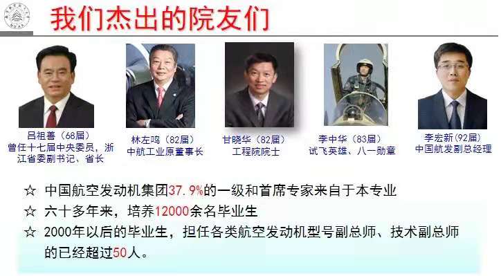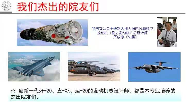 传承前辈的远大志向与优良传统,多年来飞动专业为我国持续输送了大批“高精尖”人才——航发集团相当一部分的一级和首席专家来自于本专业,近二十年来担任各类航空发动机型号副总师、技术副总师已逾50人,最新一代歼-20、直-XX、运-20的发动机总设计师都是本专业培养出的杰出院友。