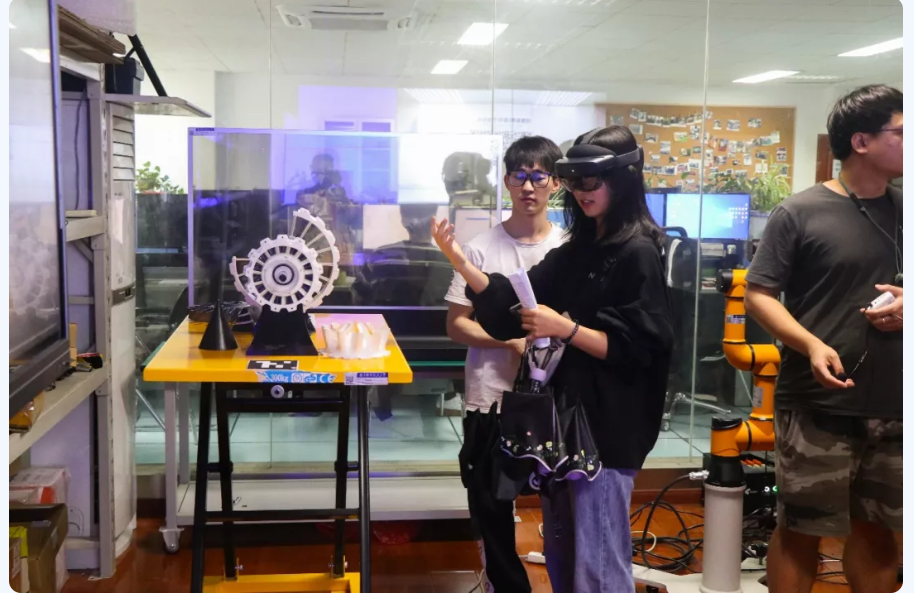 智能制造技术是我国国防基础科研的重点项目。智能制造技术实验室的研究方向主要有数字孪生、大数据、物联网和增强现实四个主要方面。大数据在智能决策支持方面有重要意义,大大提高了决策效率和生产效率。研究人员向我们展示了大数据平台,上面清晰而有序的显示着工厂的实时数据、异常情况等详细信息。然后,研究人员又向我们介绍了装配的增强现实技术,带上AR眼睛就实现了虚拟与现实的交汇,可以通过AR眼镜实现虚拟装配从而减少试错成本,提高实际装配的成功率。