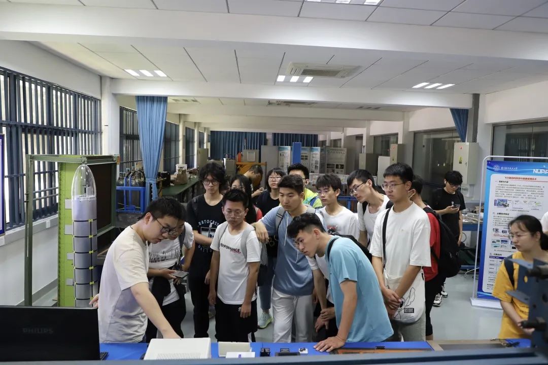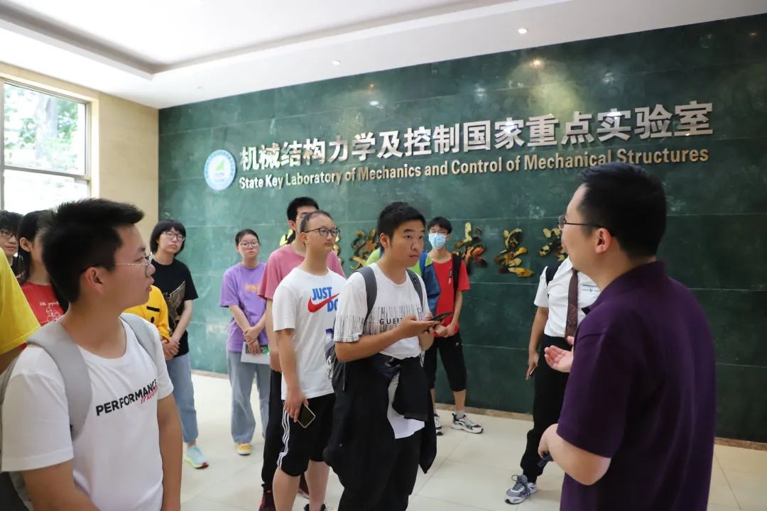 在简单介绍了机械结构力学及控制国家重点实验室后,讲解员从历史沿革、研究队伍、科学研究、研究条件、研究成果等各个方面重点介绍了结构强度实验室。该实验室是明故宫校区单体最大的实验室。在参观实验大厅时,讲解员借助真实的实验设备介绍了全机静力实验,通过展示各类试验件为同学们讲解何为结构疲劳,同学们见到了许多正在进行结构强度实验的设备,如航空发动机的机匣、舰载机着舰的尾钩、新型无人机的框架、舰载机弹射起飞的前起落架等。同学们也了解到飞行器的结构强度研究是设计研究飞行器最基础,也是具有重大意义的一部分。