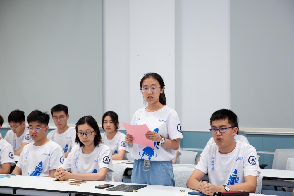 国家奖学金获得者、航空航天类首批中共预备党员陈逸菲同学代表2019级航空航天类专业学生发言,对学院两年以来的精心培养表示感谢,“两年长空人,一生长空魂”,她表示将会以此为起点志向凌霄,走向未来,以自强不息的昂扬斗志实现航空报国的理想。