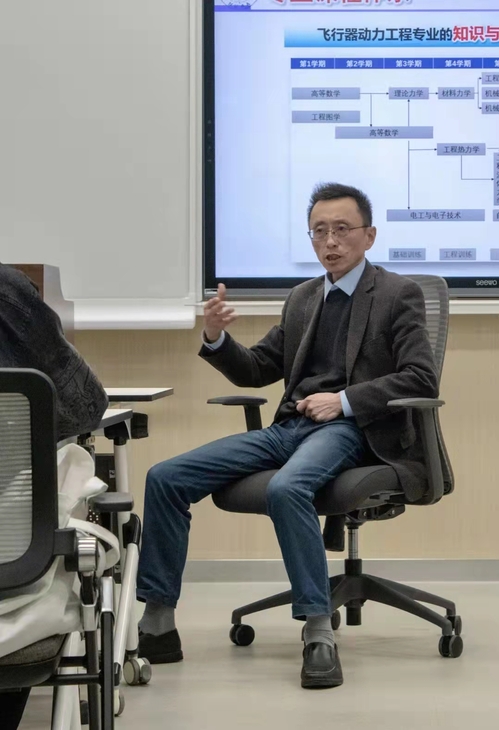 首先,张宏建教授用简洁易懂的语言向同学们介绍了我校飞行器动力工程专业的相关信息,同学们从中了解到能源与动力学院的历史、专业的培养方案以及院友们获得的众多成就。为帮助大二年级学生更好地明晰专业学习,张宏建教授还特别向同学们介绍了飞行器动力工程的“气、固、热、控”四个发展方向,及其相关的特定培养课程。
