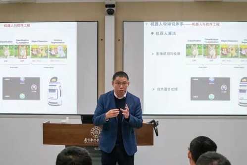 随后,陈柏教授向同学们介绍了与机器人相关的学科知识。他指出,机器人本质上就是软件和硬件的结合体。软件部分涵盖了通讯、控制算法、人机交互等,而硬件部分则包括机器人结构、传感器、控制器、驱动器等。机器人工程专业是多学科交叉的典型代表,涵盖机械、电子、控制、力学、计算机等多学科。陈教授也向有志于机器人研发的同学们提出了相关建议,强调要培养相关的专业知识与技术特长,从而更好地适应多学科交叉研究。