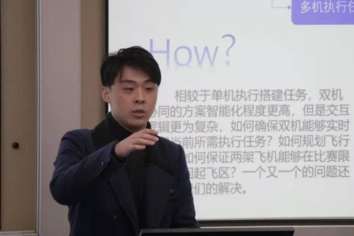 紧接着,李嘉诚学长从大学生竞赛谈起,讲述了南航零一队与南航零二队参加UAVGP(国际无人飞行器创新大奖赛)时的故事,与同学们分享了自己的参赛经验。
