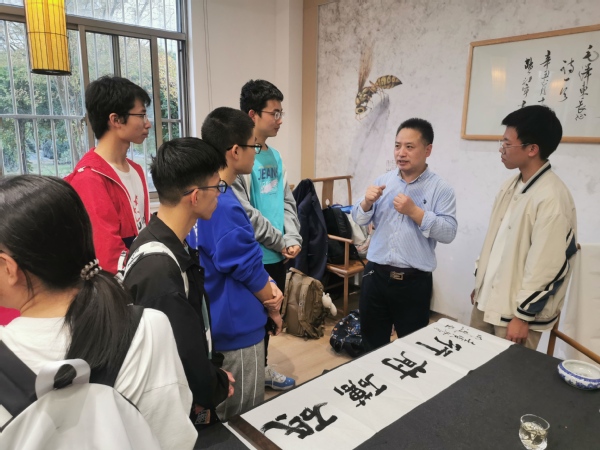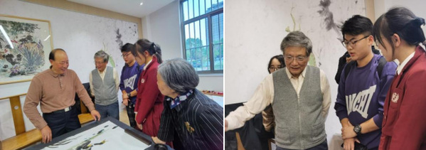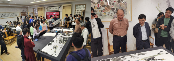 交流现场,艺术家们题字作画,寄语长空学子,并分享自己的创作和生活经历。何鸣分享了他与张永荣即兴创作国画作品时的心路历程,“永荣和我之间有一种默契”,在这幅画创作过程中,张永荣所画静态之景和何鸣所画动态之物相映成趣,富有生机。何鸣谈道,画水墨画最重要的是心中意境要与画中的美感相平衡,勉励学生将所思所感与文化艺术相融合,努力让中国传统文化走向世界。