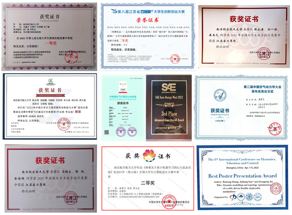 近两年长空创新班82项大创结题项目研究成果丰硕,学生依托大创项目获中国国际飞行器挑战赛冠军、全国大学生物理实验竞赛一等奖、SAE国际航空设计大赛季军、江苏省“互联网+”大学生创新创业大赛二等奖等19项高水平竞赛奖项,撰写18篇论文投稿至SCI等国际学术权威期刊和国际学术会议,获得国家发明专利和计算机软件著作权授权25项,制作双涵道无源流体推力矢量验证火箭、倾转涵道垂直起降飞行器等科创实物作品36项,编写软件系统及程序58项。长空创新班学术导师高度评价学生大创项目,其中,郭万林院士指出马锦暄同学的国家级大创项目“拓展了诺奖工作”。