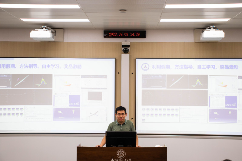 会上,往届班主任代表、航空学院冯国旭老师就班主任工作分享了经验。冯国旭提出,作为班主任需要了解学生、关爱学生、引导学生,利用学长指路、经验分享、鞭策激励和内外联动等教育手段,让学生高效利用假期,充分激发学生学习自主性。同时,在谈到指导学生参与科创的相关经历,冯国旭指出班主任要积极发挥专业优势,成为学生专业学习和实践的引路人,在指导学生科研创新中精准引导、下足功夫。