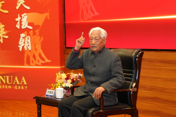 郑永安代表学校党委向方祖岐一行到来表示热烈欢迎,向《一个老兵的探索与感悟》新书出版表示热烈祝贺。他表示,方将军是我国国防事业发展的见证者和贡献者,他文武双全、笔耕不辍,用自己的光辉事迹和优秀作品诠释了对党和国家的赤子之心,展现了一个中国人、一个共产党人、一个老兵的责任、追求和信念,展示了中国军人忠诚正直、敢于担当,始终胸怀“国之大者”的深厚情怀。他指出,诞生于抗美援朝烽火中的南航在71年办学历程中,坚守“为党育英才,为国铸重器”的初心使命,始终选择与国家战略需要和重大部署同向同行,为国家国防事业发展和社会经济建设作出了重要贡献。他希望,广大青年学子能以方将军为榜样,大力弘扬传承伟大抗美援朝精神,拥有爱国报国的博大胸怀,树立兴国强国的高远理想,让青春在为服务国家重大战略需求、支撑科技自立自强的不懈奋斗中绽放出绚丽光彩。