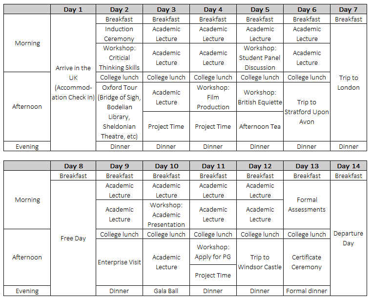 课程由:1. 跨学科学术课程; 2. 学术实践工作坊; 3. 行业特邀嘉宾讲座; 4. 英国企业参访; 5. 英式社交拓展; 6. 英伦文化体验;等六部分组成。